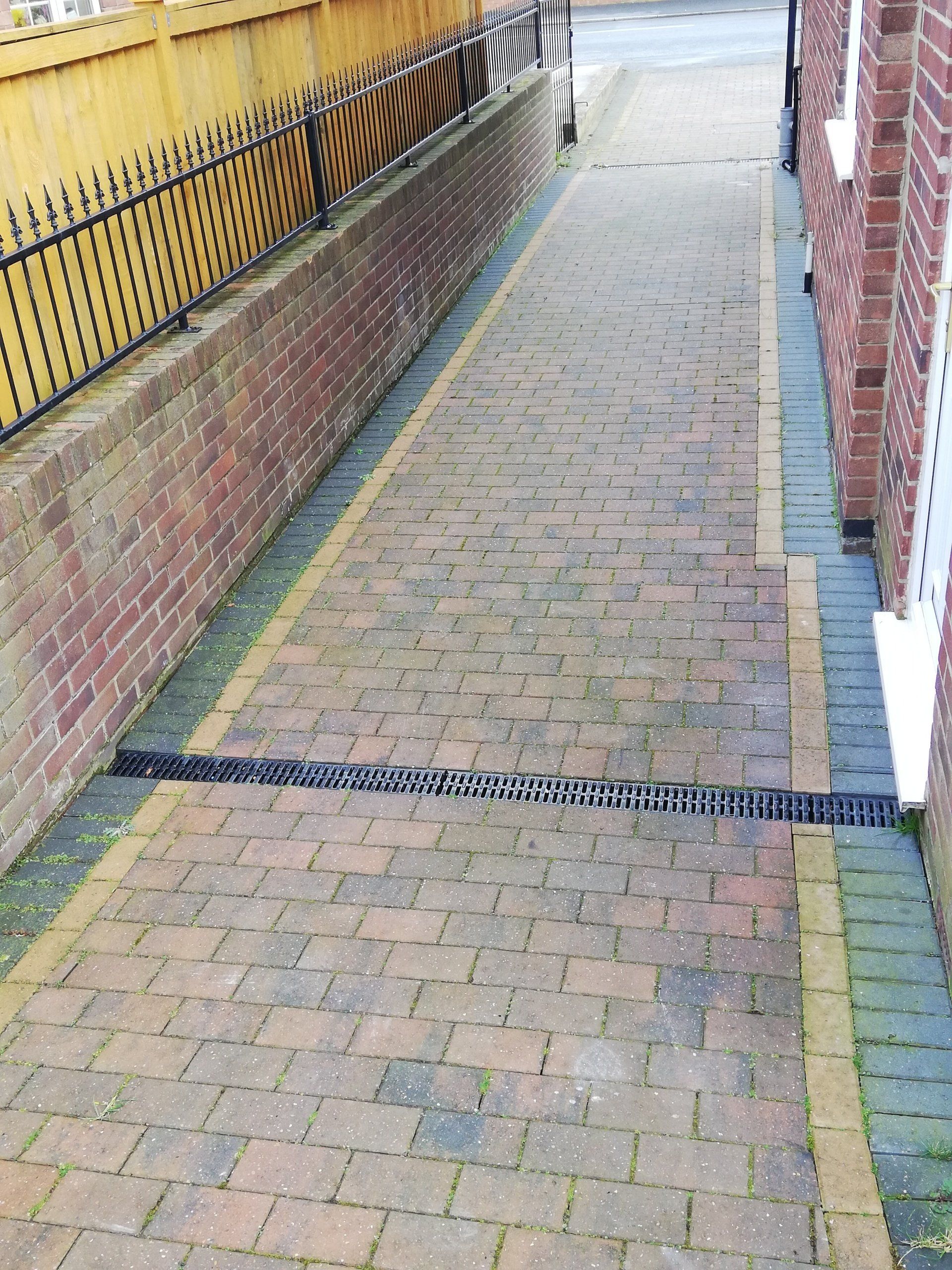 Block paving and wall showing years of dirt and algae